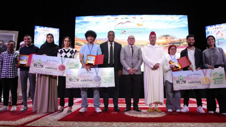كما تخلل الحفل تتويج الفائزين في مسابقة أفضل فكرة مشروع التي هدفت إلى تشجيع روح المبادرة والابتكار لدى الشباب، حيث أسفرت النتائج عن فوز مشروع “S’OUFOUSS Atelier” بالمرتبة الأولى من خلال تقديم تجارب سياحية تفاعلية تُشرك الزائر في التراث المحلي عبر ورشات عملية مثل الرسم على الحجر وصناعة الصابون بالورد وتشكيل الفخار والخبز الأمازيغي وسط الواحة، فيما نال مشروع “ALNIF ECO-EXPLORATION” المرتبة الثانية بفضل رؤيته الرامية إلى تحويل التراث الأحفوري والثقافة الواحية إلى رافعة للتنمية المستدامة عبر أنشطة رياضية وبيئية وبنية تحتية صديقة للبيئة، أما المرتبة الثالثة فكانت من نصيب مشروع “EXPERIENCIA”، وهو تطبيق رقمي مبتكر يربط السياح المحليين والأجانب بمقدمي تجارب أصيلة في مدينة تنغير مما يساهم في تحويلها إلى وجهة سياحية متكاملة.